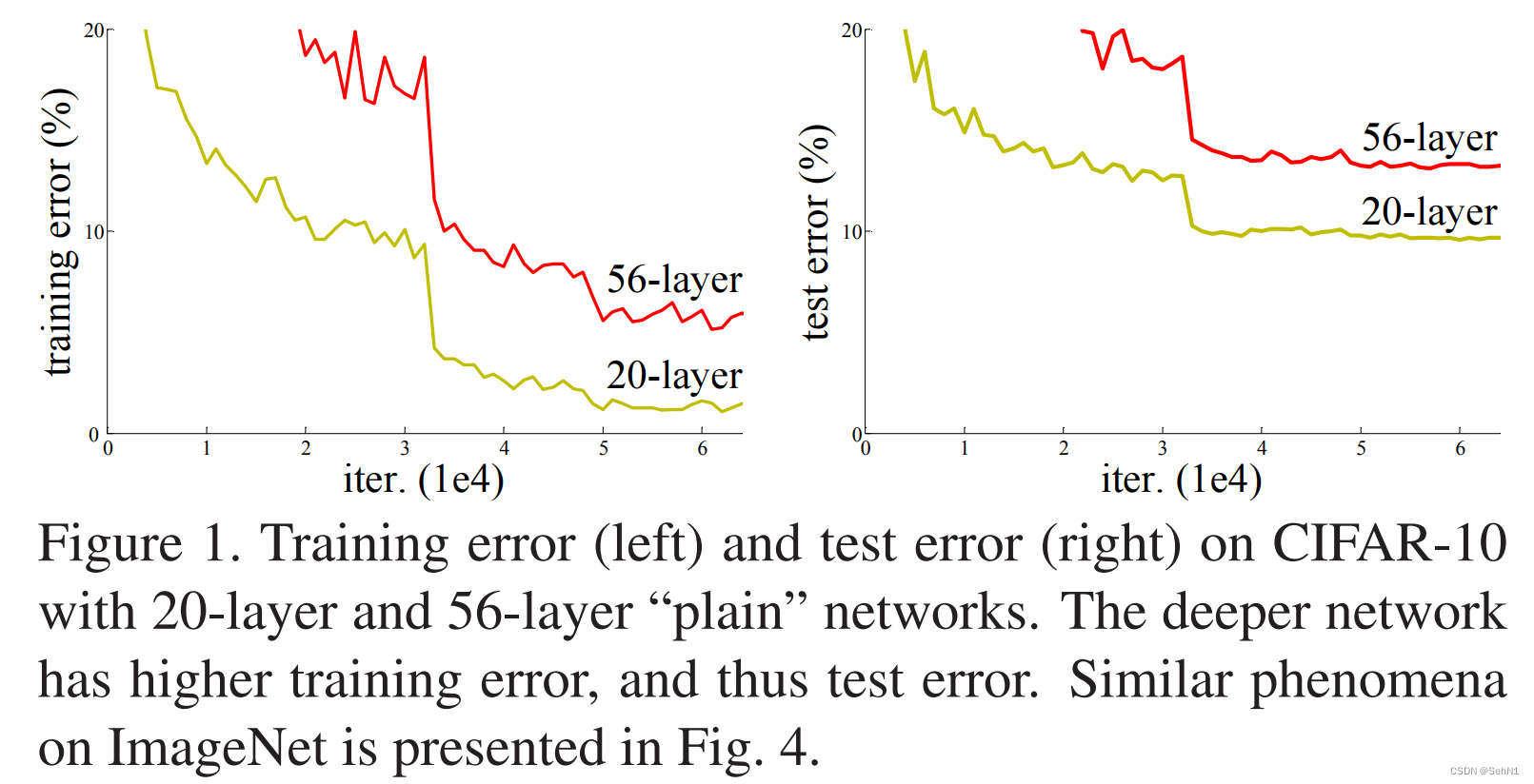为了提高神经网络模型的准确性,我们常常会堆叠更多的层来帮助模型更好的学习特征表示,然而层数的增加也带来了不少问题,如梯度消失/爆炸、过拟合、计算资源消耗量大等。虽然梯度消失问题可以通过归一化初始化和中间归一化层得到有效的解决,但随着网络层数的增加,模型的准确率并不会一直增加。相反,当准确率达到饱和时,再增加网络层数,准确率反而会下降。如图2所示,网络层数更高的网络反而具有更高的训练损失和测试损失。 然而,残差学习不仅有效的解决了梯度消失/爆炸的问题,还大幅提升了深层神经网络的精度,使得模型准确率可以从网络层的大幅增加中可以获得提升。