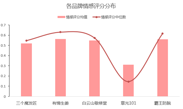 除章光101外,其他品牌情感评分均值都在0.5之上,情感以积极为主。为什么章光101平均值、中位数如此之低?这么多负面评价品牌都无动于衷吗?