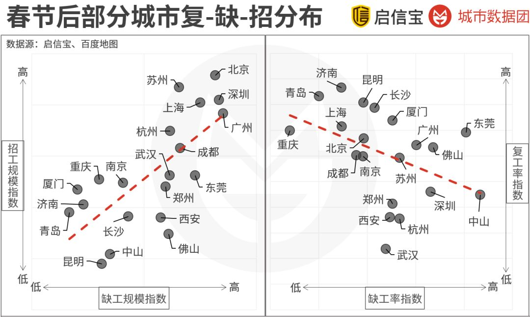 右上角:缺工率高、招工率也高;包括以广州、杭州、深圳为代表的一线与准一线城市,它们面临的缺工困难较大,但恢复的意愿和信心也都非常强。