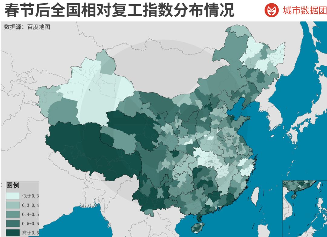 (图中绿色越深,相对复工指数越高)