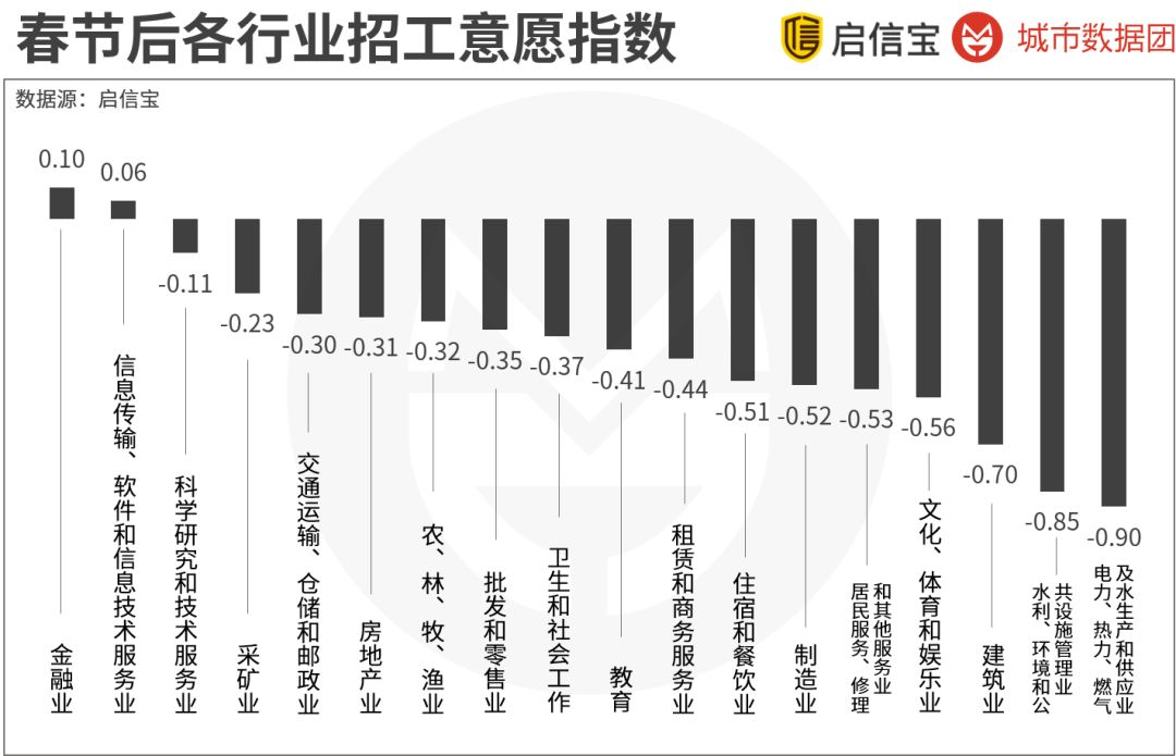 在普遍较弱的情况下,招工意愿增强的行业是金融和信息服务。