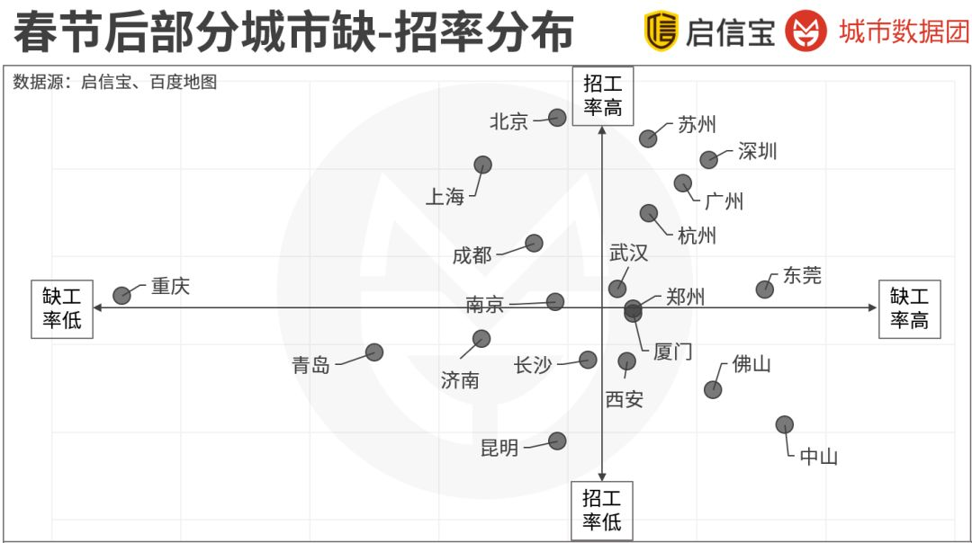 左下角:缺工率低、招工率也低;包括青岛、济南、昆明等城市,其劳动力缺失情况不严重,而相应地,招工意愿也较为一般。