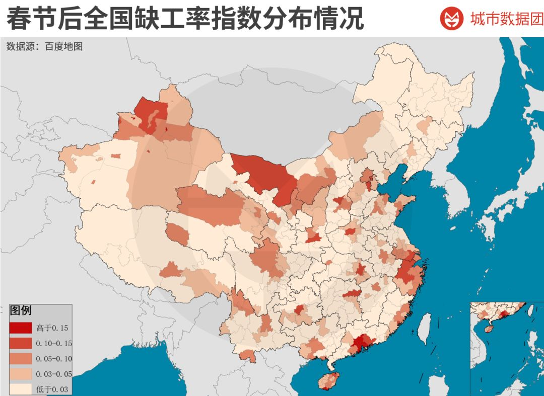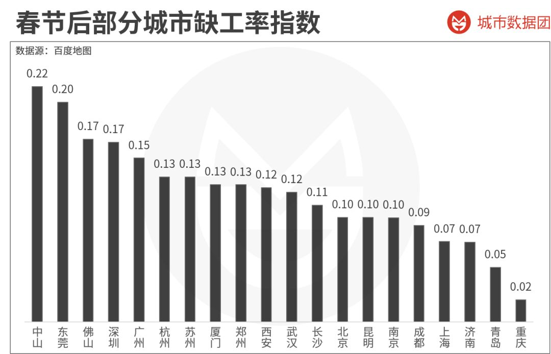 (说明:数据来源为百度地图。缺工率指数不等于实际缺工率,但可以近似代表每个城市单位人口规模下的缺工情况。)