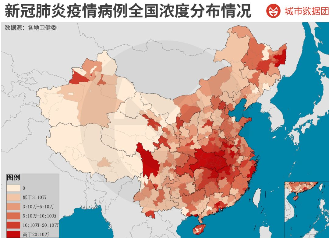 这张图乍看之下似乎规律并不明显。但如果我们把这张图与下面这张“病例浓度图”(新冠肺炎确诊人数/常住人口数)进行比较,将会发现二者有很强的空间互斥性。
