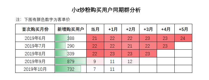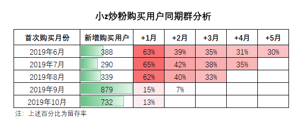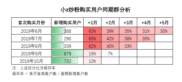 这不,小z业余出摊卖炒粉也没丢掉分析师的数据执着。他把每个月新购买的客户数据进行记录,并统计每个月新增客户,在之后几个月份(直到19年10月)的复购情况,如下图:
