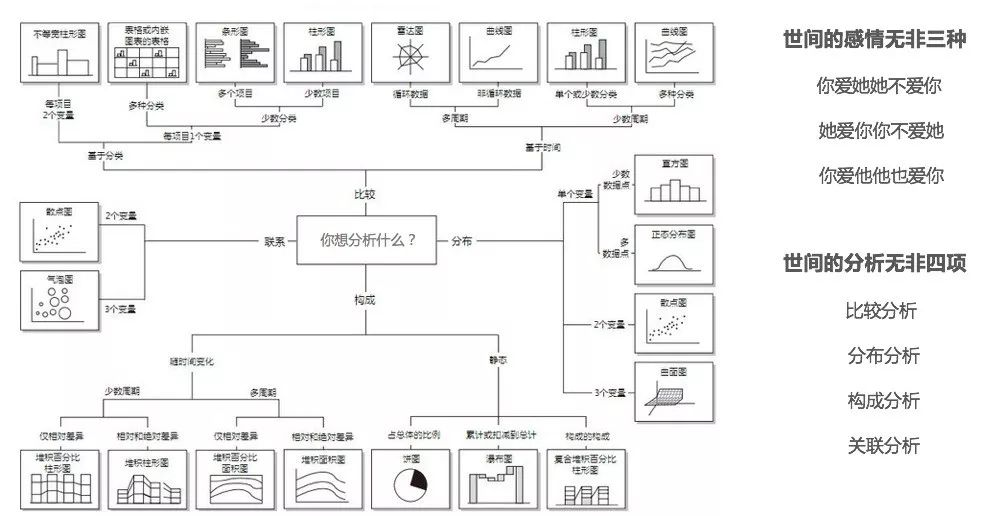 那我们到底该选取什么样的可视化方法去呈现我们的报告呢?这里参照国外大神的经验,总结了一个万能图表,供大家参考: