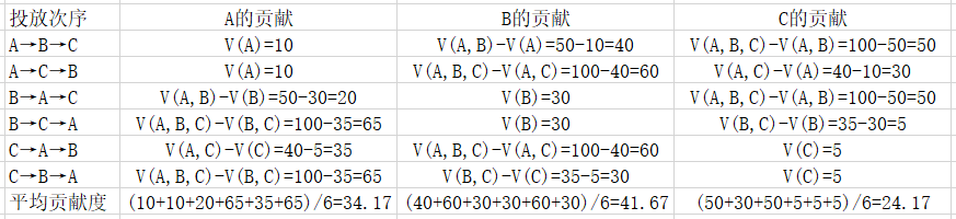 因此,信息流A的Shapley value为34.17,开屏B的Shapley value为41.67,视频前贴C的Shapley value为24.17。