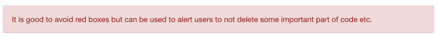 It is good to avoid red boxes but can be used to alert users to not delete some important part of code etc.