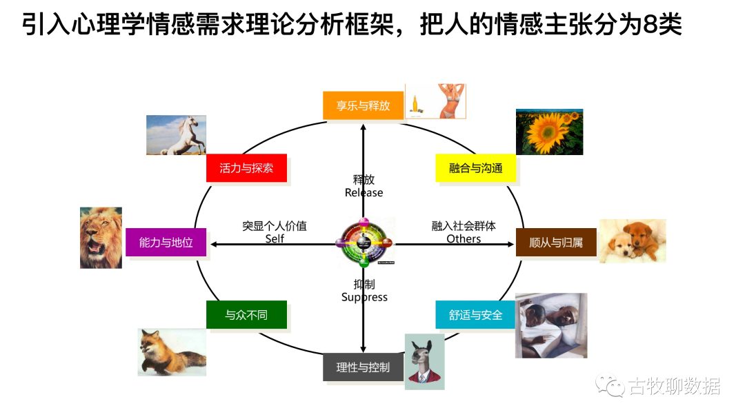 爬回来那些有价值的数据之后,需要在加工之前,先有一个理论依据,那就是人的情感诉求到底怎么分类、分成几类。这里就体现出,品牌广告是需要与社会科学结合的,毕竟是研究消费者心智的