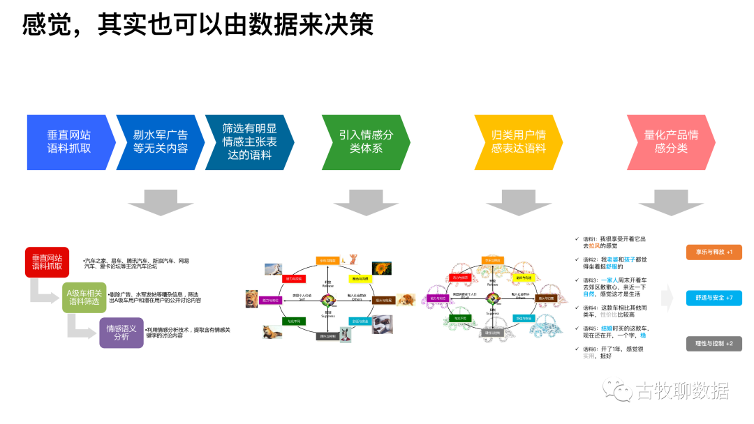 这种调调和感觉,也可以通过数据辅助给出。具体分4个大步骤、6个小步骤。从评论数据的抓取和清洗,到引入社科领域的情感分类体系,到把数据按情感分类体系进行归类,最后就能量化的得到每个产品在消费者心目中的那个feel了,下面分步骤详细拆解,以汽车为例