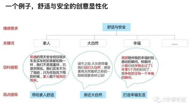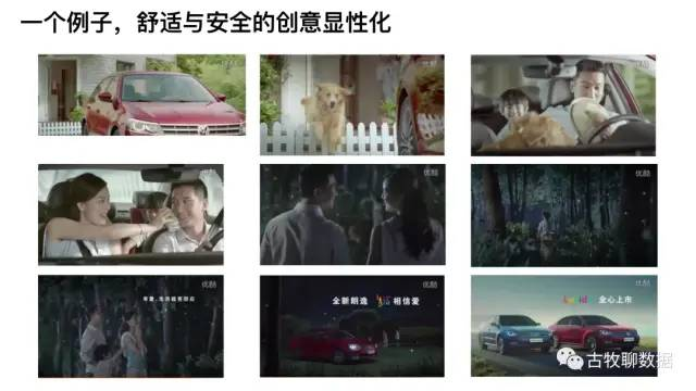 知道了一款车具体的情感分类标签有什么用呢?其实是可以具像化的来设计广告的调性,比如上面这个例子,这款车70%的情感表达都集中在舒适与安全上。再聚焦看下这里面的词,有“家人”“大自然”“幸福”这些,把他们稍加理解,就可以转化为很直观的概念了。比如带给家人舒适、亲近大自然、打造幸福的生活,OK我们闭眼想象一下,符合上述3个概念的广告是什么样的呢?