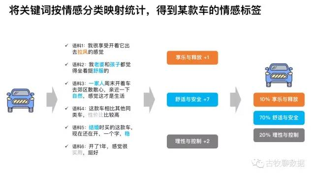 最后就是实际操作了,如上图演示,假设我们爬虫爬到某款车的全部评论就6条,切词之后发现有1个词属于享乐与释放,有7个词属于舒适与安全,有2个词属于理性与控制,那么这款车在消费者心中的情感标签就是10%的享乐与释放、70%的舒适与安全、20%的理性与控制
