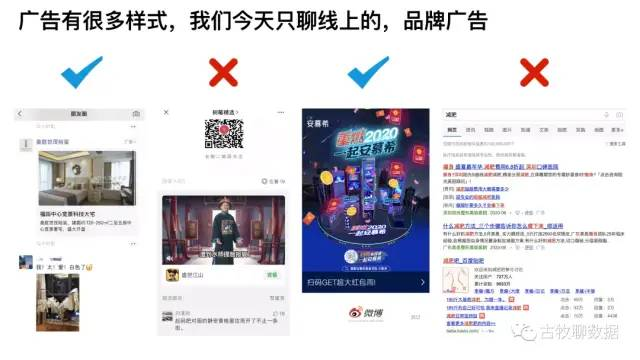 广告有很多样式,既可以按线上线下这种渠道来分,也可以按视频文字这种体裁来分,还可以按效果品牌这种目标来分,今天我们就只说线上广告中的品牌广告。先通过几个图感性化的认识下品牌广告好了,上图中的1和3,分别是朋友圈广告和微博开屏广告,它们算品牌广告;而2和4分别是公众号底部广告和百度搜索结果广告,它们不算品牌广告,算效果广告。其实两者现如今的界限已经越来越模糊了,品效合一嘛~如果非要做区分的话,可以用能否“直接给产品带来价值”来衡量。效果广告往往可以直接给产品带来用户、或者下单购买,而品牌广告则更加潜移默化