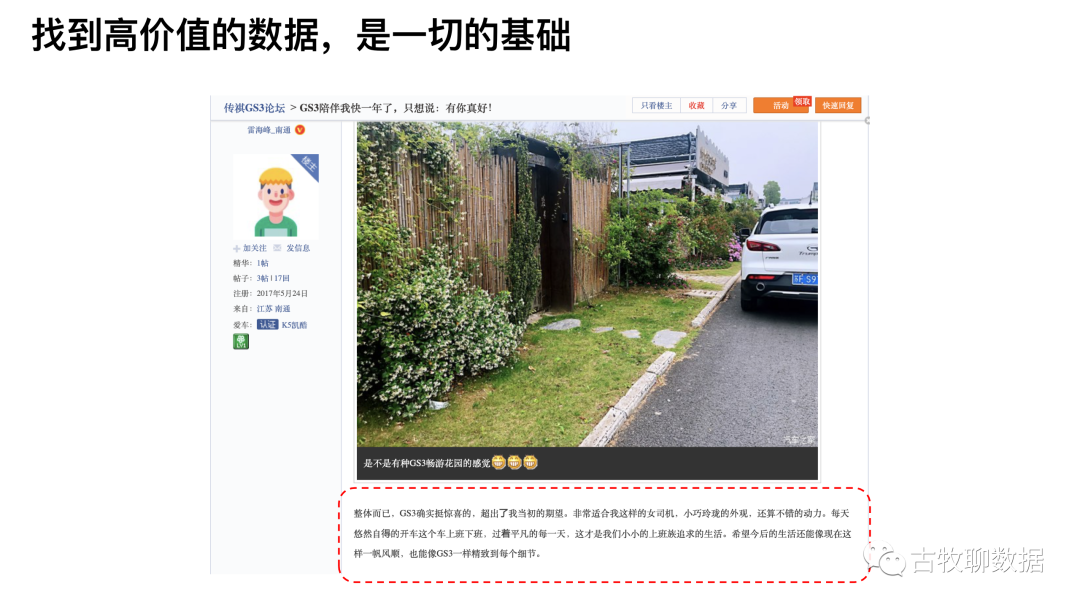 我们的目标是了解消费者对具体某款车的感性感受,那么就需要首先去一个这类言论最多的地方,一般就是汽车垂直论坛了;其次,我们要保证这些评论都是消费者的真实感受,不能是水军或者广告刷屏;最后,要确保这些评论是有明确情感倾向表达的,不能辛辛苦苦爬虫爬回来一堆评论数据,都是厌世、性冷淡的陈述句。以上这些都需要下苦功夫去搞定,也是让数据发挥价值的基础,但往往会被人为的忽略