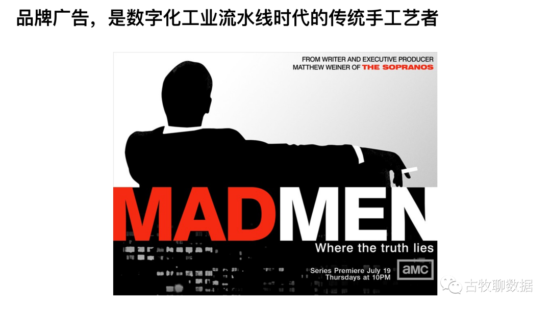 很多朋友可能受影视作品的影响,还以为现在是《广告狂人》那种古典时期,但其实那个抽烟、喝酒、熬夜、 脑爆以求灵感闪现的时代,已经一去不复返了。现在我们日常看到的很多广告,都是机器自动化计算并投放到你眼前的。尤其是那种纯文字链接形式的广告,那种以追求消费者点击下单购买为己任的广告,更是高度的程序化、流水线化。唯有品牌广告,因为其独特的目标,还保留了些许传统手工艺者的姿态,还骄傲的需要人来参与