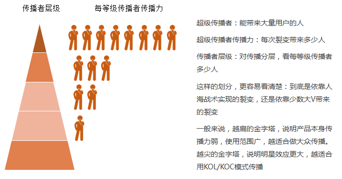 裂变流的核心在于:参与裂变的用户有多大比例能真正响应,响应裂变的用户能带来多少新增。因此裂变流喜欢讲K因子(K因子=邀请数*转化率)。以此衡量裂变效果。不过从实际操作上看,超级传播者分析思路会更适合。因为每次裂变,真正能带来大量新增的往往是少数KOL或者至少是个KOC,所以区分是否存在超级传播者,到底传播力有多少,对于设计裂变方式有非常重要的参考意义: