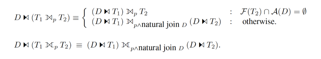 第一组规则是最基本的规则,等式中的 ⊗⊗ 说明它不限制连接类型,可以是 {×,LOJ,∃,∄}{×,LOJ,∃,∄} 中的任意一个。