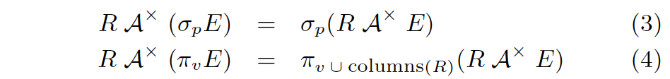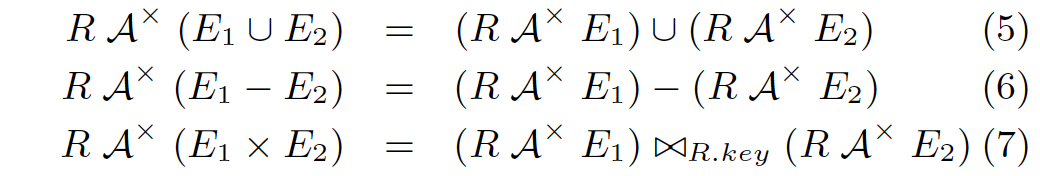 下面的等式中,×× 表示 Cross Join,⋈R.key⋈R.key 表示按照 RR 的 Key 做自然连接:r∘e1∘e2r∘e1∘e2 。和之前一样,我们假设 RR 存在主键或唯一键,如果没有也可以在 Scan 的时候加上一个。
