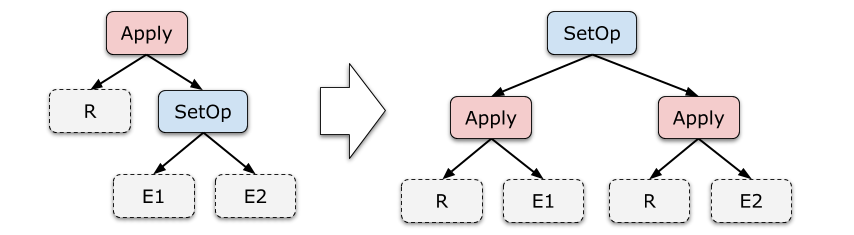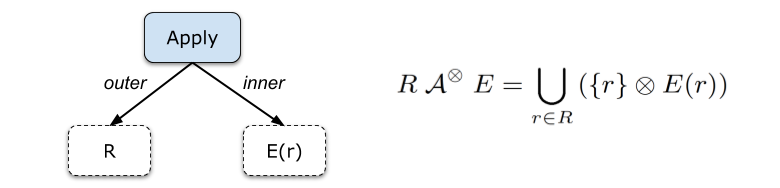 Apply 算子(也称作 Correlated Join)接收两个关系树的输入,与一般 Join 不同的是,Apply 的 Inner 输入(图中是右子树)是一个带有参数的关系树。