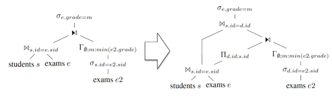 下面是对 Query 2 应用规则 (3) 的例子。之后再应用规则 (1),就完成了去关联化过程。