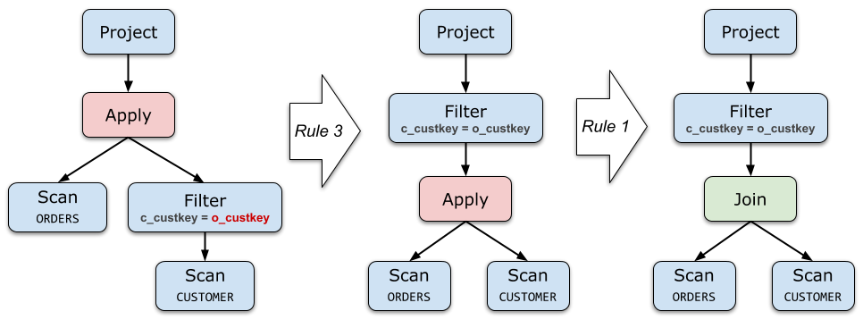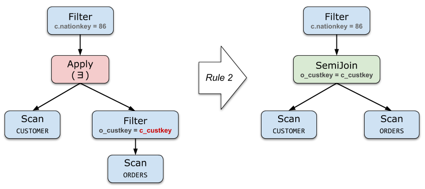 上文说到的 Relation - Expression - Relation 这种交替引用不仅执行性能堪忧,而且,对于优化器也是个麻烦的存在——我们的优化规则都是在匹配并且对 Relation 进行变换,而这里的子查询却藏在 Expression 里,令人无从下手。