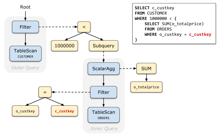 我们以 Query 1 为例,直观地感受一下,为什么说关联子查询的去关联化是十分必要的。