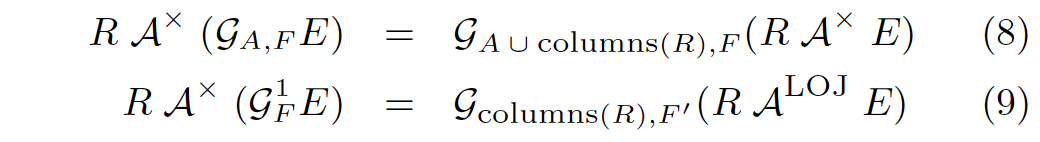 下面等式中,GA,FGA,F 表示带有 Group By 分组的聚合(Group Agg),其中 AA 表示分组的列,FF 表示聚合函数的列;G1FGF1 表示不带有分组的聚合(Scalar Agg)。