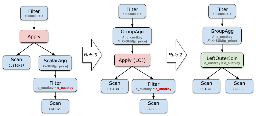 我们稍后就会看到这样做的巨大收益:当 Apply 被推最下面时,就可以应用第一组规则,直接把 Apply 变成 Join,也就完成了子查询去关联化的优化过程。
