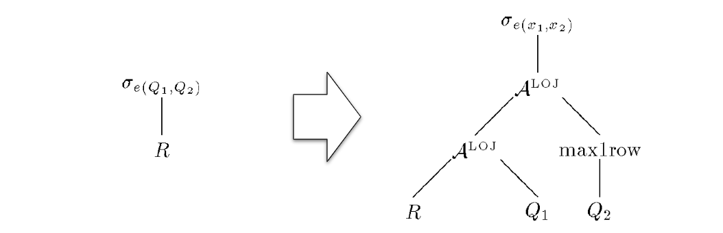 如果某个算子的表达式中出现了子查询,我们就把这个子查询提取到该算子下面(留下一个子查询的结果变量),构成一个 ALOJALOJ 算子。如果不止一个子查询,则会产生多个 ALOJALOJ。必要的时候加上 Max1RowMax1Row 算子。