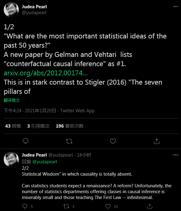 值得一提的是,Judea Pearl在推文中表示,“对作者将因果推理列入其中感到欣慰,这与Stigler在《统计学七支柱》中的总结截然不同,后者完全没有提到因果推理。”另外,他也对大学统计专业很少安排因果推理课程感到担忧,“统计学可以期待复兴或改革吗?不幸的是,统计系中提供因果推理课程的非常少,更不用提教'The First Law'的,简直是无穷少。”