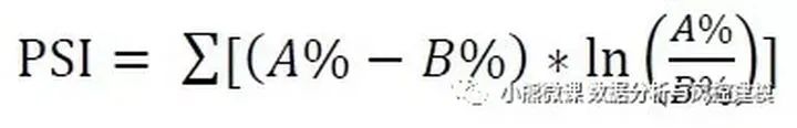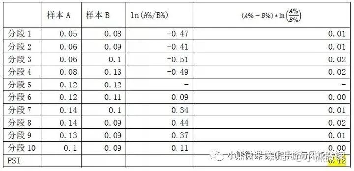 假设我们要比较样本A与样本B中某一变量Y的分布,首先按照同一标准将Y分为几个区间(通常分为10段),计算样本A和样本B中每个区间的占比。在每个区间段上,将两个样本的各自占比相除再取对数,然后乘以各自占比之差,最后将各个区间段的计算值相加,得到最终PSI。