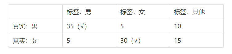 举个例子,【性别】标签,用户A真实情况是男性,但是打标签打成了女性,那么这就是一个错误的标签值。假设100万用户,真实情况50万男性50万女性,有以下表格: