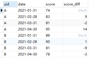 SELECT *, score - lag(score) over(partition by uid order by date) as score_diff from score