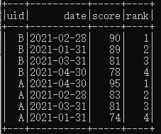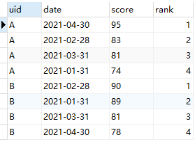 SELECT *, row_number() over(partition by uid order by score desc) as `rank` from score