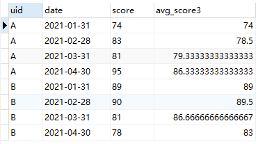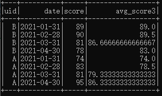 SELECT *, avg(score) over(partition by uid order by date rows between 2 preceding and current row) as avg_score3 from score