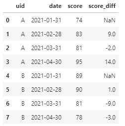 df.assign(score_diff=df.sort_values("date").groupby("uid")['score'].diff(1))