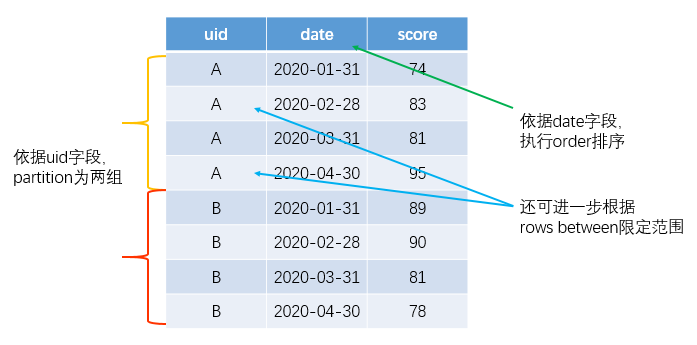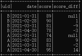 A2:首先,仍然是依据uid字段进行partition;而后由于是要计算本月成绩与上月成绩的差值,所以此次的排序依据应该是date;进一步地,由于要计算差值,所以需要对每次月考成绩计算其前一行的成绩(在按照uid进行切分并按照date排序后,上月成绩即为当前行的前一条记录),所以配套函数即为lag。