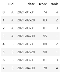 df.assign(rank=df.assign(num=1).sort_values("score", ascending=False).groupby("uid")['num'].cumsum())