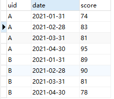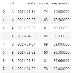 值得指出的是,对于每名学生,当切分窗口不足指定窗口大小(即目标行数)时会按实际的数据进行聚合,例如学生A,1月31日对应的近3次平均分即为本月成绩自身;2月28日对应近3次平均分即为本月成绩和上月成绩的平均分,而3月31日和4月30日计算的近3次平均分则为真正意义上的3次成绩均值。