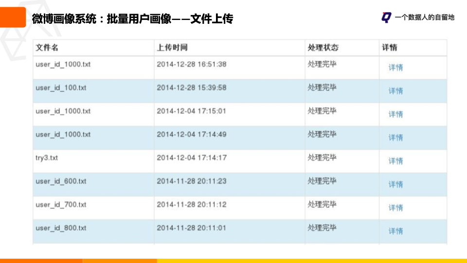 文件上传模块,支持用户将需要分析的用户ID写在一个txt文件中,通过前端页面传到后台进行分析。文件中的每个用户ID使用换行分隔符隔开,原则上每个文件的大小不超过10M。