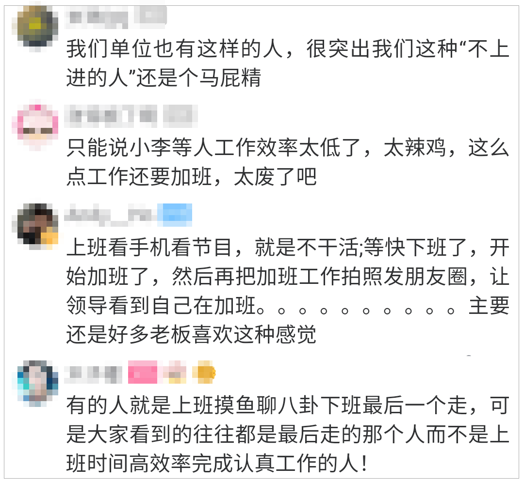 @网友H:正常人都觉着没问题的考勤。但偏偏有这样的猪队----上班看手机看节目,就是不干活;等快下班了,开始加班了,然后再把加班工作拍照发朋友圈,让领导看到自己在加班。我们公司就有,你还别不信,底下的人都知道,只有领导不知道!!