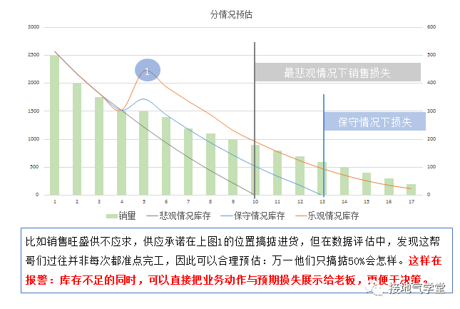 注意:在过程中预警的时候,要考虑业务部门应激行动。比如有可能业绩很好,库存马上要断,此时应了解是否有补货计划,如果有,在预警时要提及此时,并且分乐观(100%按时完成计划)、保守(50%或更少完成计划)、悲观(无法完成计划),分别给出预警,以及预估结果(如下图)。