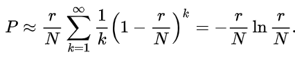 因为这已经变成了一个概率问题了,假设总共有N个人,在面试的前r个人中,我们记住一个最优秀的人为k,那么从第r+1个人开始,只要大于k的,就选择,那么我们要求的是能够最大化成功选中最优秀面试者的概率可以近似为: