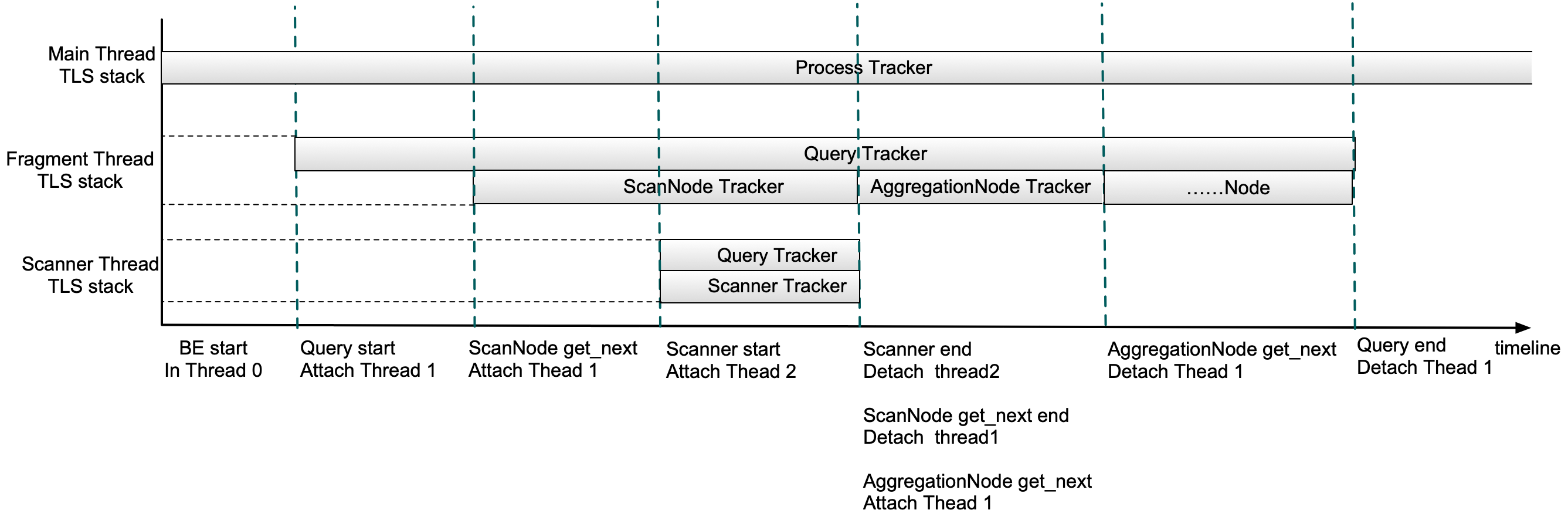 - Scanner 结束后,将 Scanner 线程 TLS Stack 中的 MemTracker 全部移除,随后 ScanNode 调度结束,将ScanNode MemTracker 从 Fragment 执行线程中移除。随后 AggregationNode 被调度时同样将 MemTracker 添加到 Fragment 执行线程中,并在调度结束后将自己的 MemTracker 从 Fragment 执行线程移除。