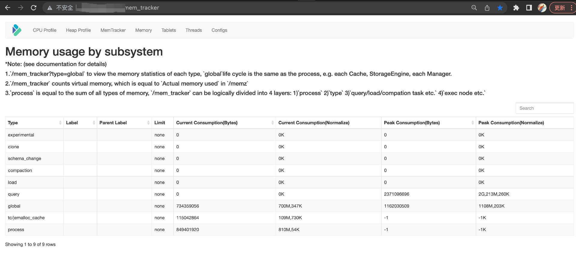 Doris 使用 MemTracker 跟踪内存的申请和释放来实时分析进程和查询的内存热点位置,MemTracker 记录着每一个查询、导入、Compaction 等任务以及Cache、TabletMeta等全局对象的内存大小,支持手动统计或 MemHook 自动跟踪,支持在 Web 页面查看实时的 Doris BE 内存统计。