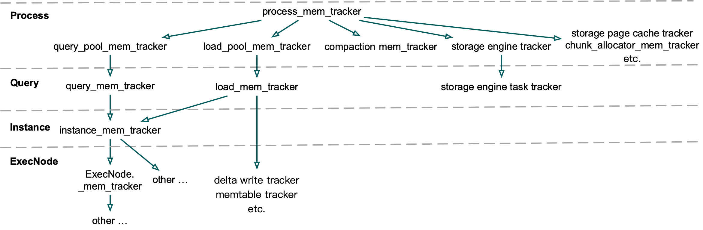 在 Doris 1.2.0 中引入了新的 MemTracker 结构,去掉了 Fragment、Instance 等不必要的层级,根据使用方式分为两类,第一类 Memtracker Limiter,在每个查询、导入、Compaction 等任务和全局 Cache、TabletMeta 唯一,用于观测和控制内存使用;第二类 MemTracker,主要用于跟踪查询执行过程中的内存热点,如 Join/Aggregation/Sort/窗口函数中的 HashTable、序列化的中间数据等,来分析查询中不同算子的内存使用情况,以及用于导入数据下刷的内存控制。后文没单独指明的地方,统称二者为 MemTracker。