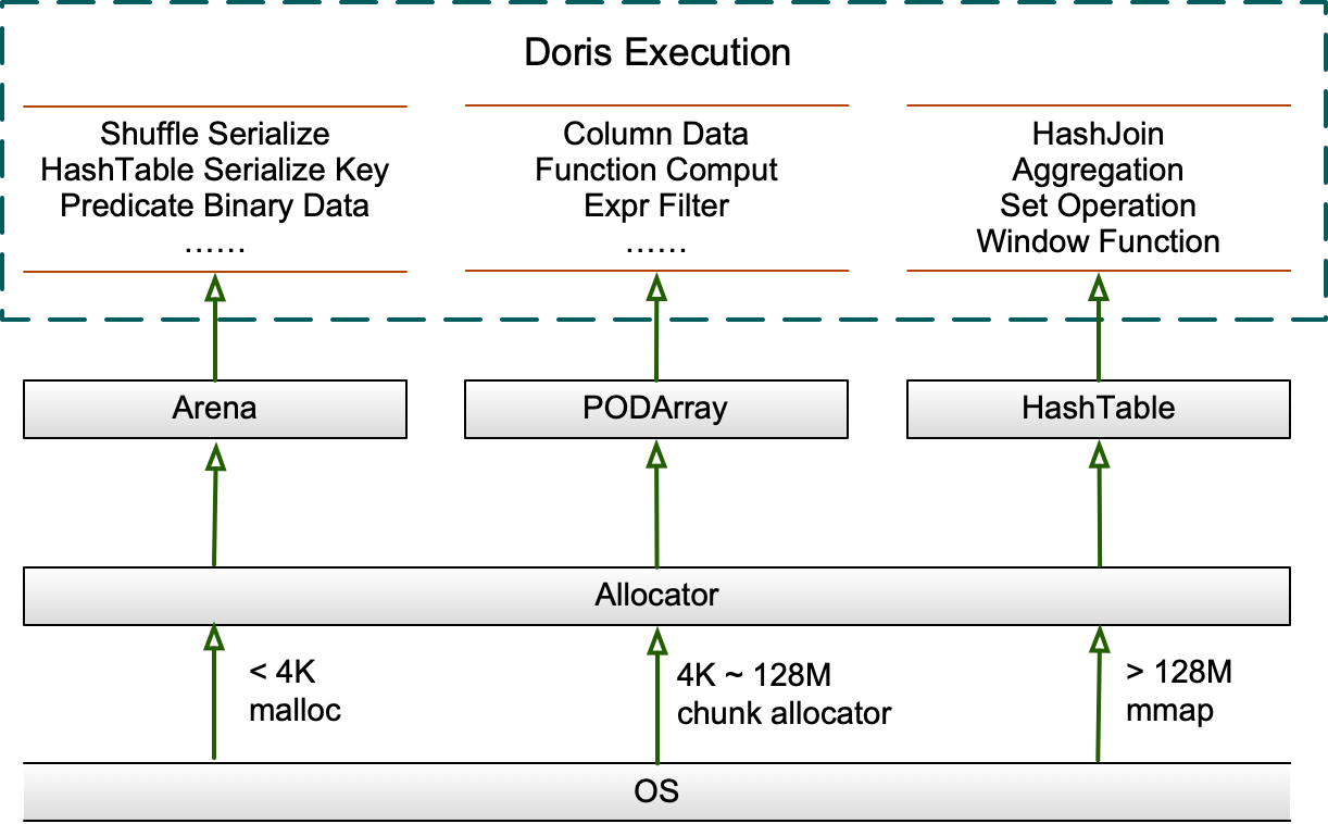 Allocator 作为系统中大块内存申请的统一的入口从系统申请内存,并在申请过程中使用 MemTracker 跟踪内存申请和释放的大小,执行算子所需批量申请的大内存将交由不同的数据结构管理,并在合适的时机干预限制内存分配的过程,确保内存申请的高效可控。