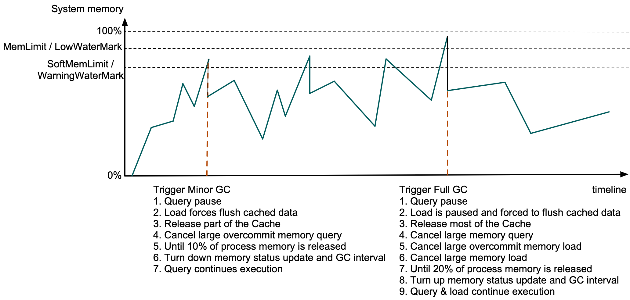 若 BE 进程内存超过 MemLimit(默认系统总内存的 90%)或系统剩余可用内存低于 Low 水位线(通常不大于1.6GB)时触发 Full GC,此时除上述操作外,导入在强制下刷缓存数据时也将暂停,并释放全部 Data Page Cache 和大部分其他 Cache,如果释放的内存不足 20%,将开始按一定策略在所有查询和导入的 MemTracker 列表中查找,依次 Cancel 内存占用大的查询、内存超发比例大的导入、内存占用大的导入,直到释放 20% 的进程内存后,调高系统内存状态获取间隔和 GC 间隔,其他查询和导入也将继续执行,GC 的耗时通常在几百 us 到几十 ms 之间。