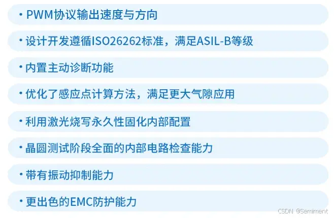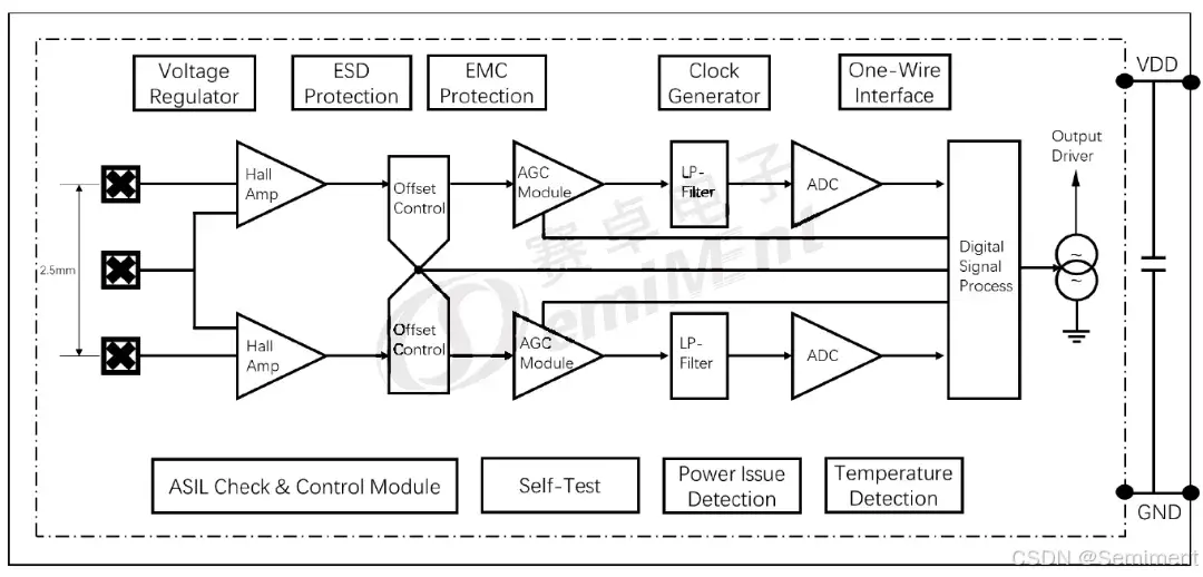SC9683TS是新一代带有功能安全机制的霍尔轮速传感器IC。其基于霍尔感应原理技术实现磁性极轮或铁磁性齿轮的旋转速度和旋转方向的探测。相比于上一代的轮速传感器芯片SC9641/42,SC9683TS在功能、性能、可靠性上做了大幅度的提升。