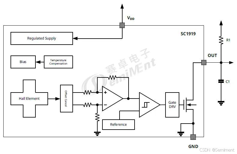 内部集成:每个器件在单个硅芯片上集成了高压稳压器、霍尔电压发生器、小信号放大器、斩波稳定器、施密特触发器,以及具备10mA灌电流能力的漏极输出。